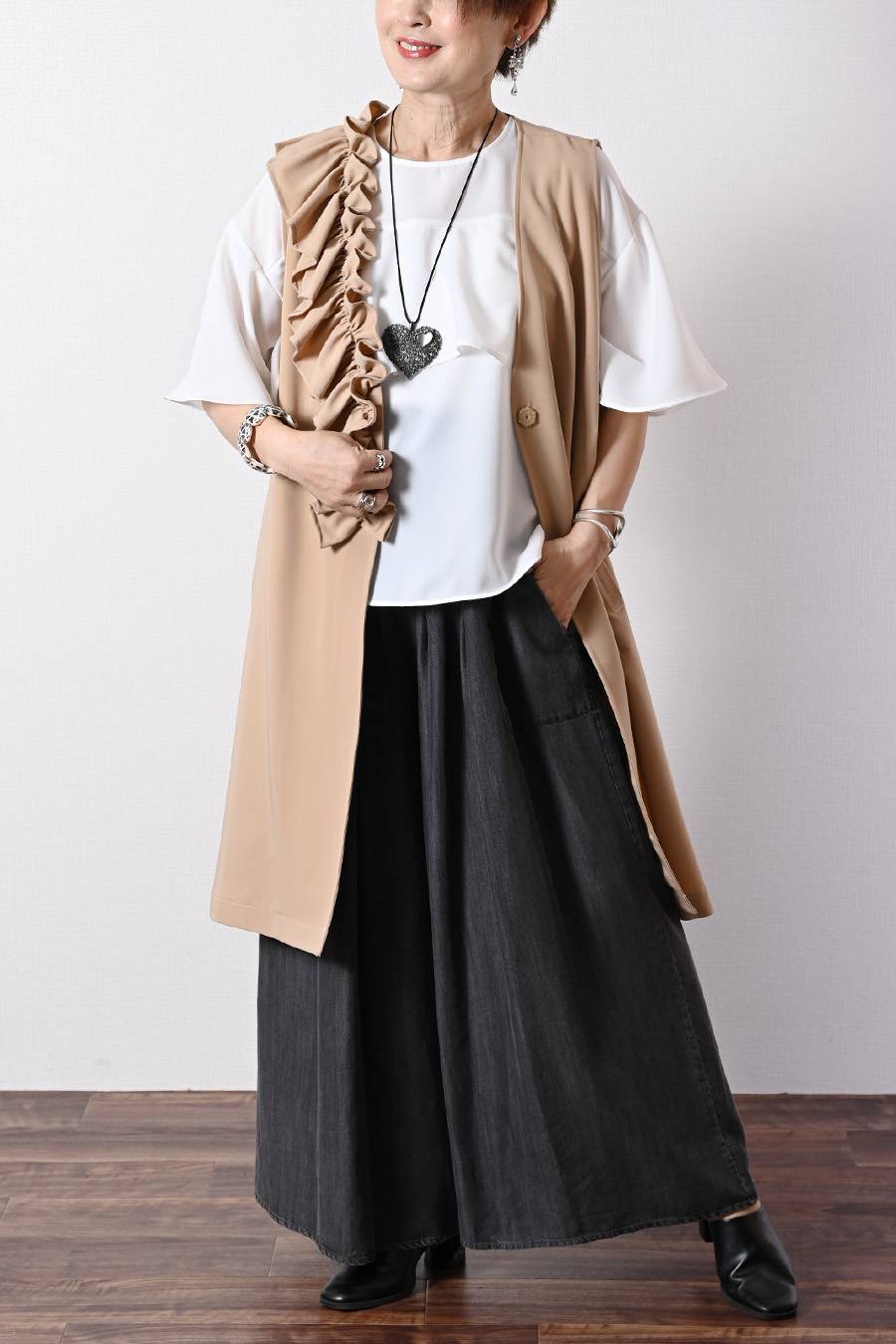 Tシャツを合わせたカジュアルスタイルはもちろん、あえて甘めのブラウスを合わせて甘辛バランスもお勧めです。