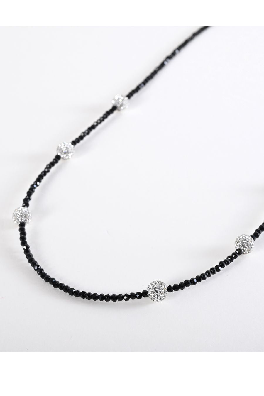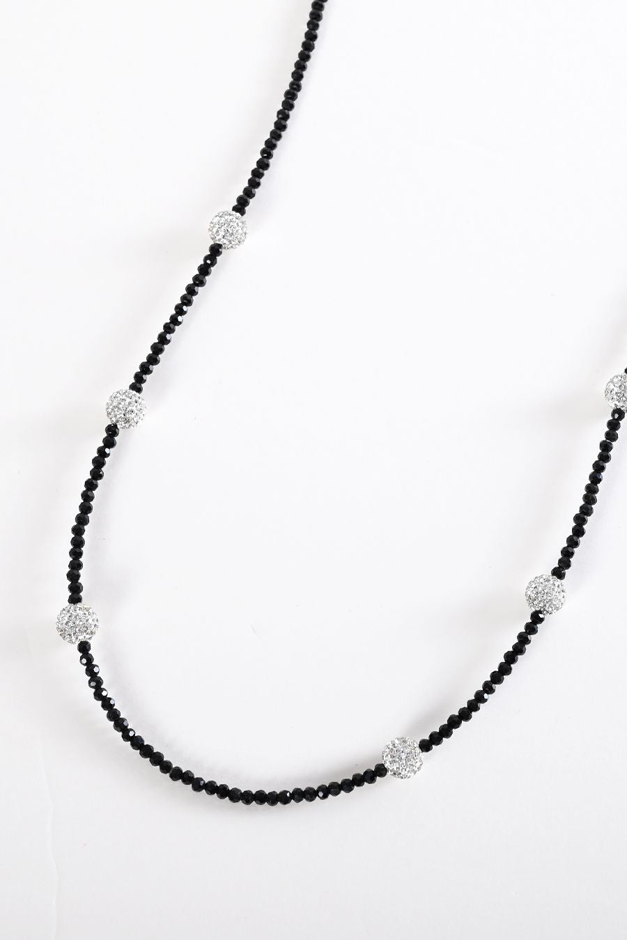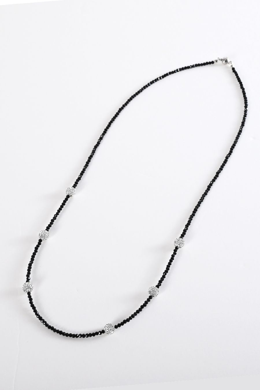 カットの施された細やかなブラックビーズと、銀色に輝くパヴェボールを組み合わせたロングネックレスです。