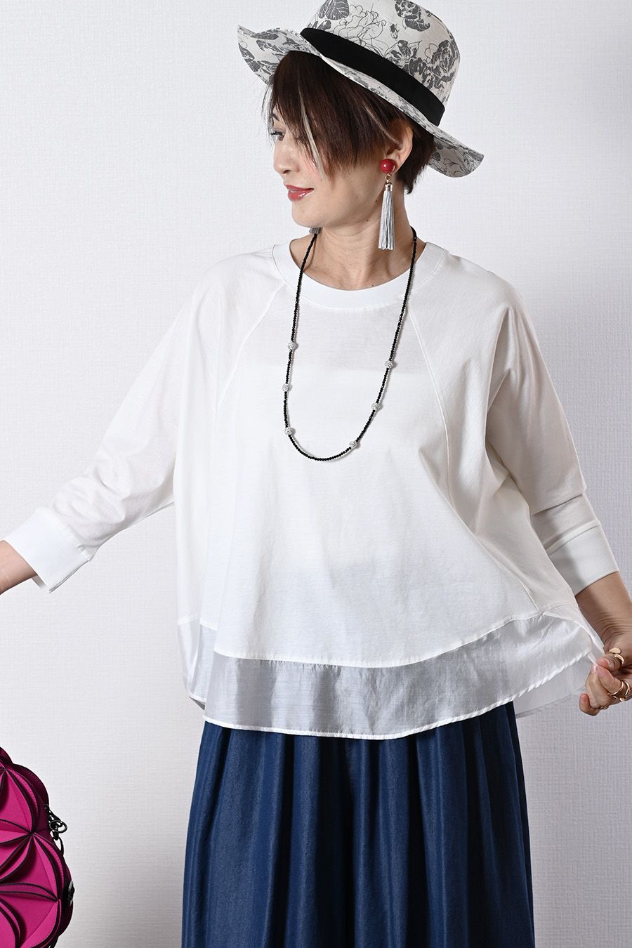 袖フリルストレッチカットソー+袖シフォンリボンメッシュニットプルオーバー2点セットコーデ