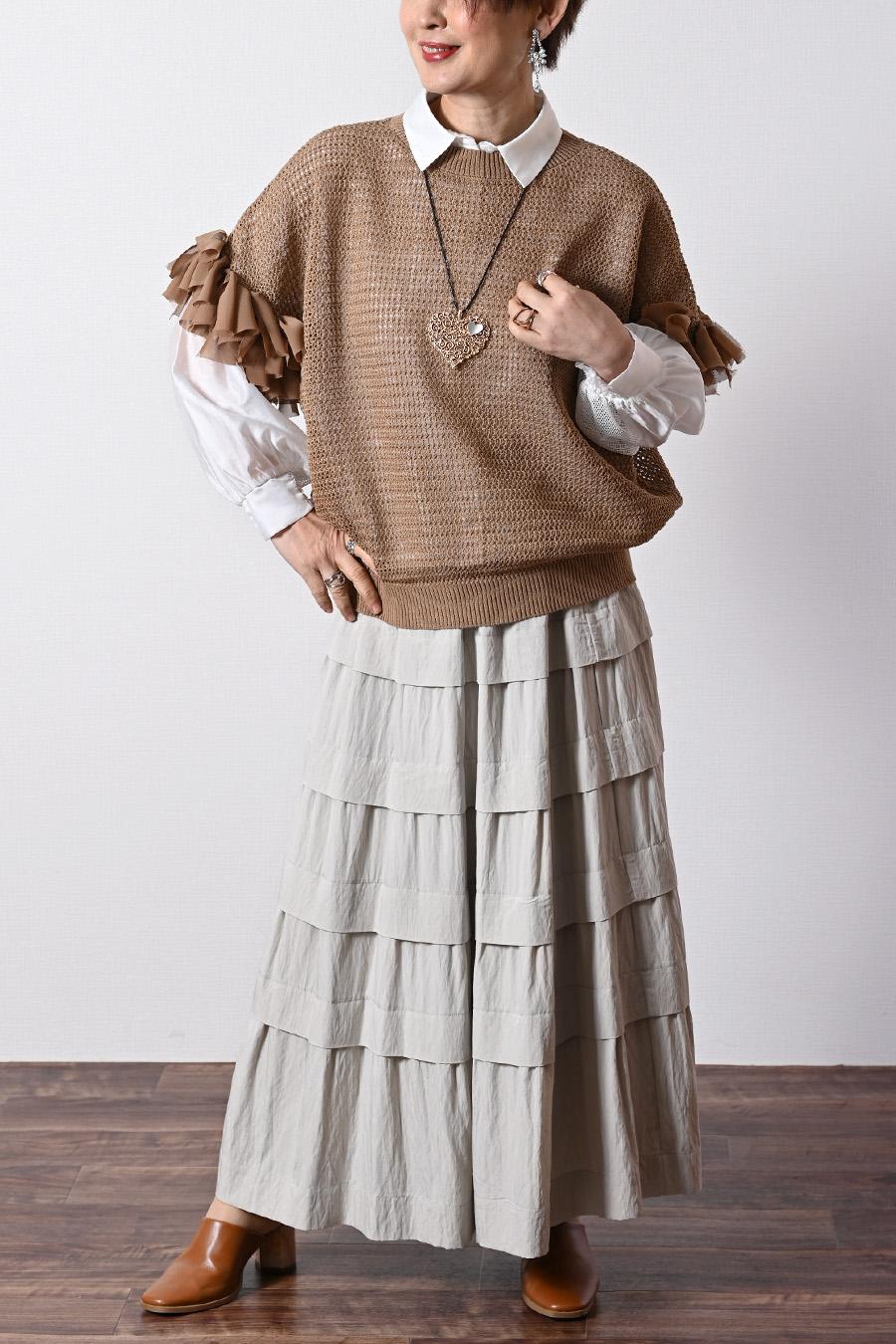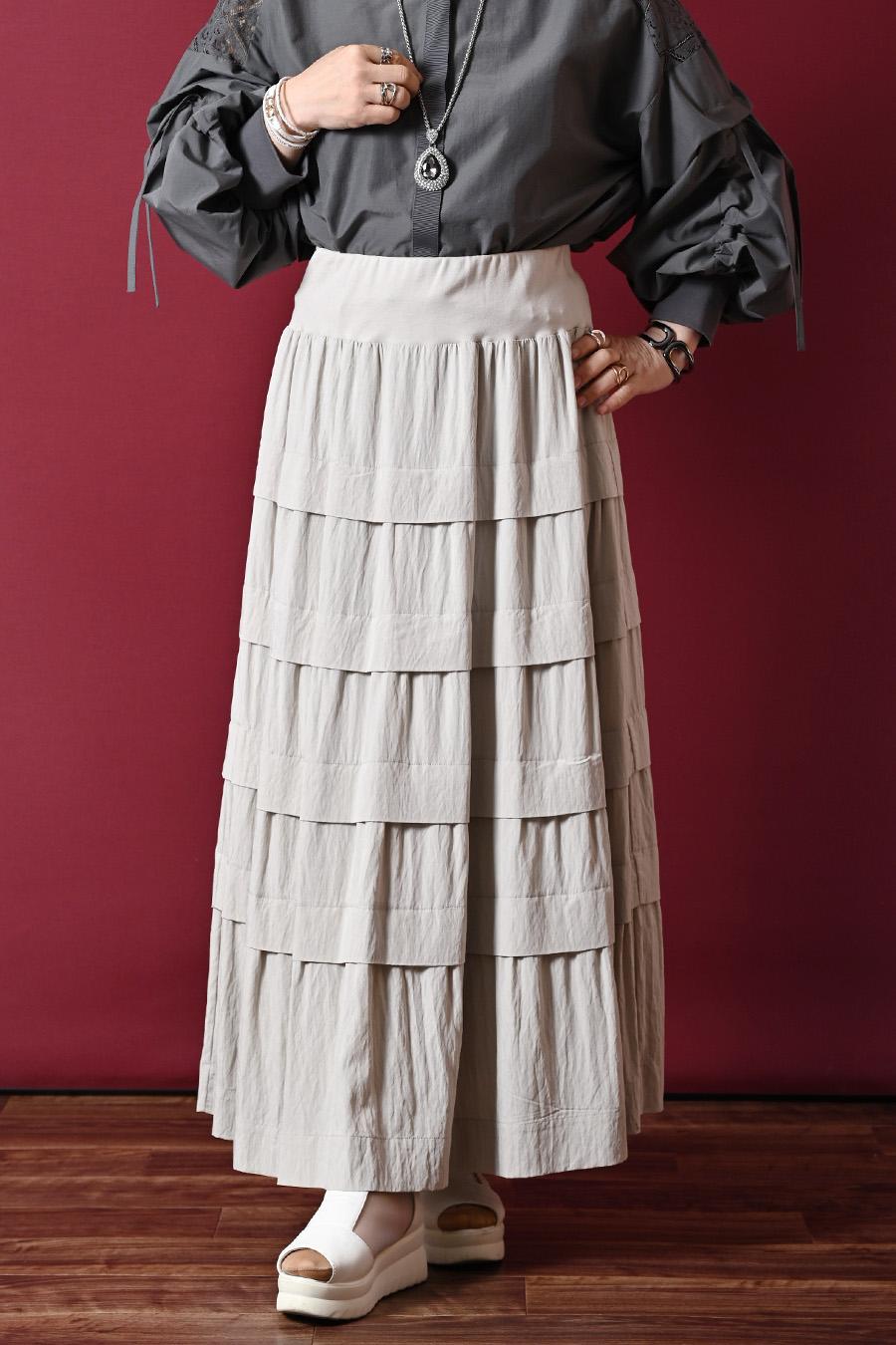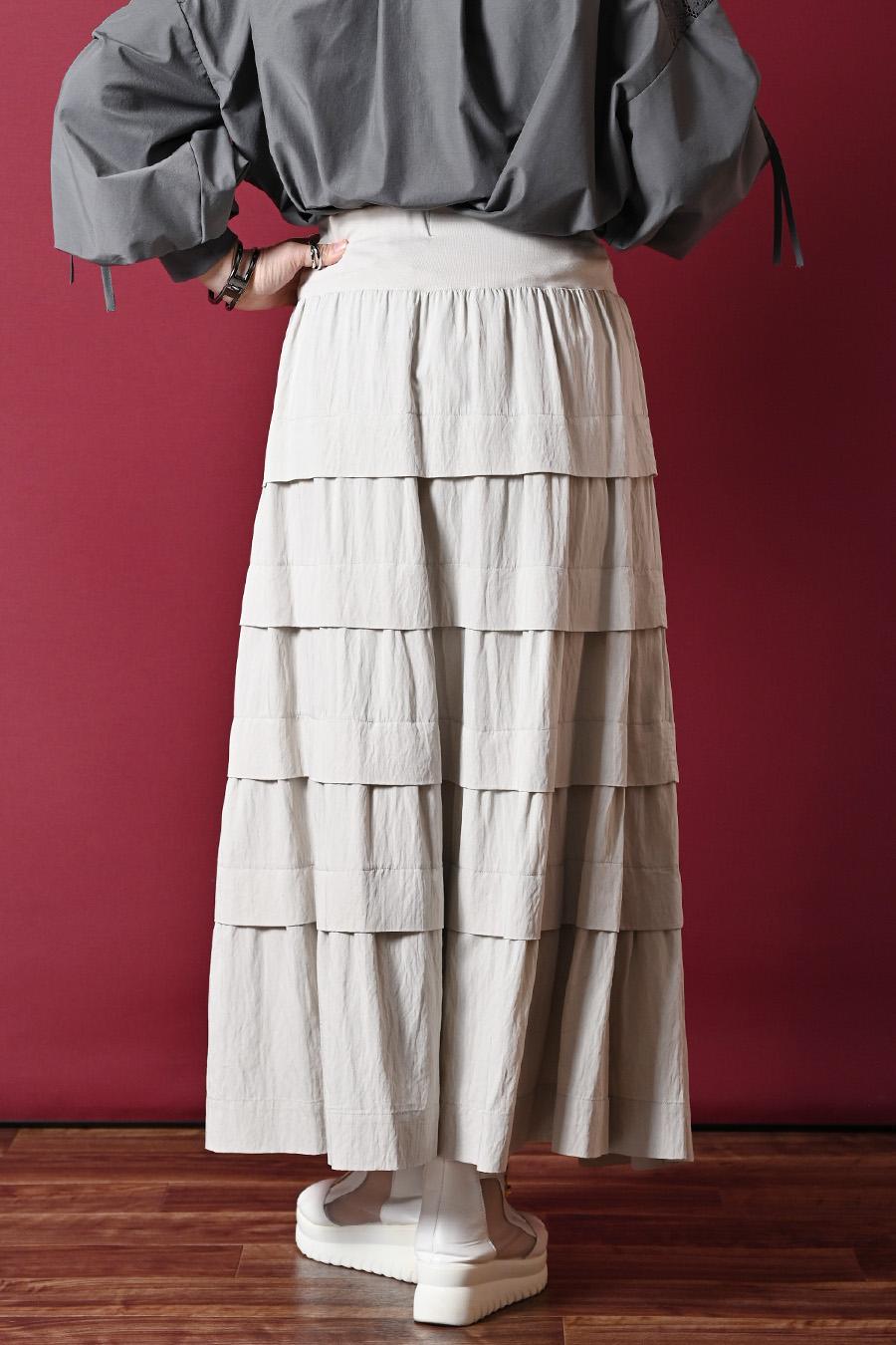 立体感溢れるティアードデザイン、 細かなリンクル加工を施し複雑な陰影を描く表情豊かなティアードスカート。
