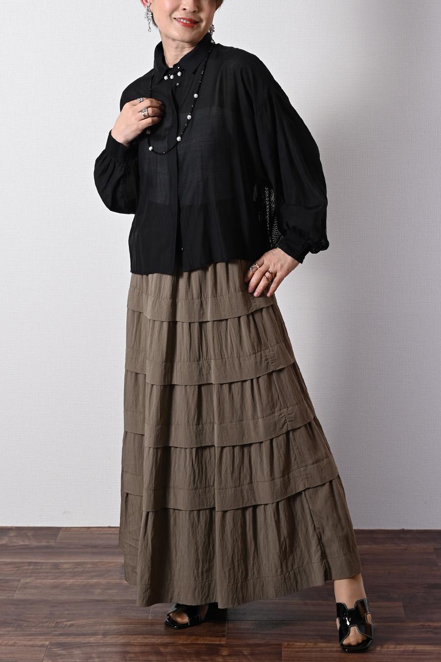 シアー×メッシュ 薄軽コンビブラウス+ワッシャーティアード ロングスカート2点セットコーデ