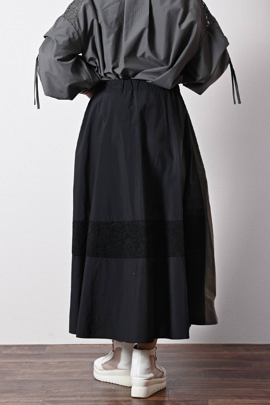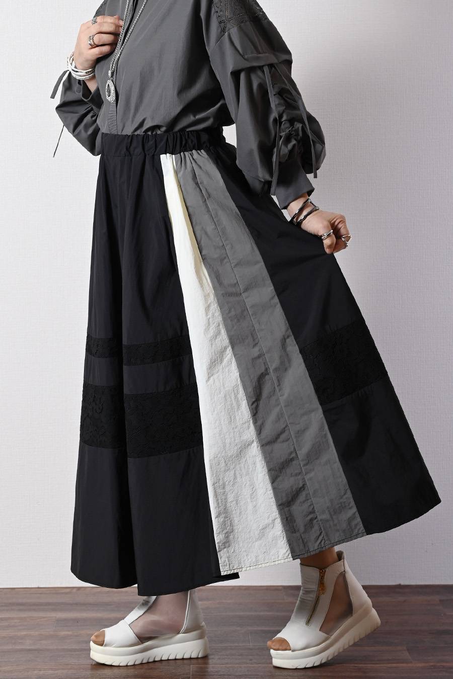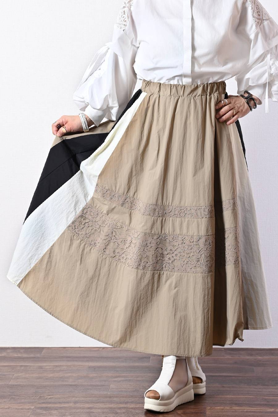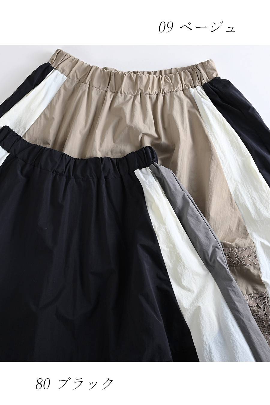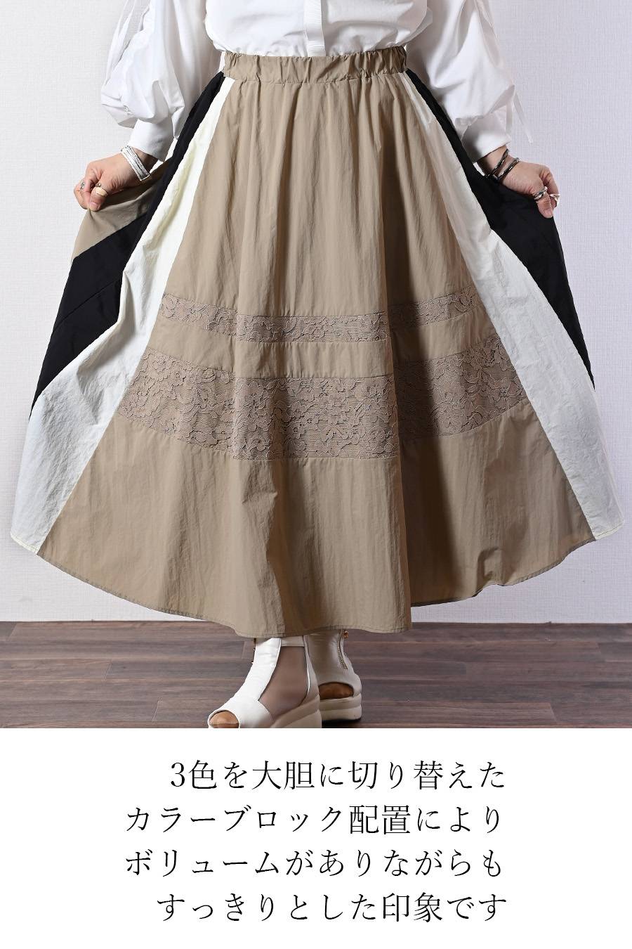 薄軽!トリコロール&レース切り替えフレアスカート