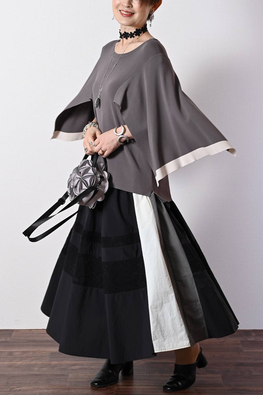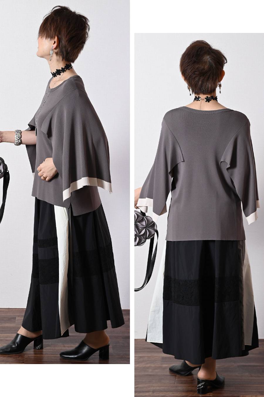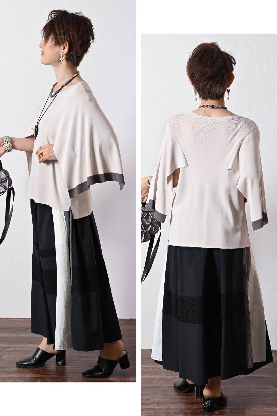 ケープスリーブ・ハイゲージニット+レース切り替えフレアスカート2点セットコーデ