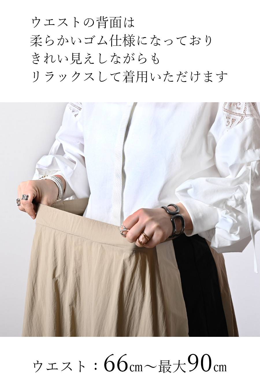 ウエストの背面は柔らかいゴム仕様になっており、きれい見えしながらもリラックスして着用いただけます。66㎝ー最大90㎝