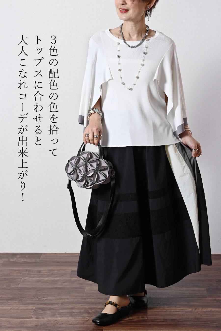 視線を釘付けにする、洗練された大人のカラーブロックと立体感のあるコードレースが、歩くたびに高級感を放つ主役級スカート。3色を大胆に切り替えたラインを強調するカラーブロック配置により、ボリュームがありながらもすっきりとした印象に。