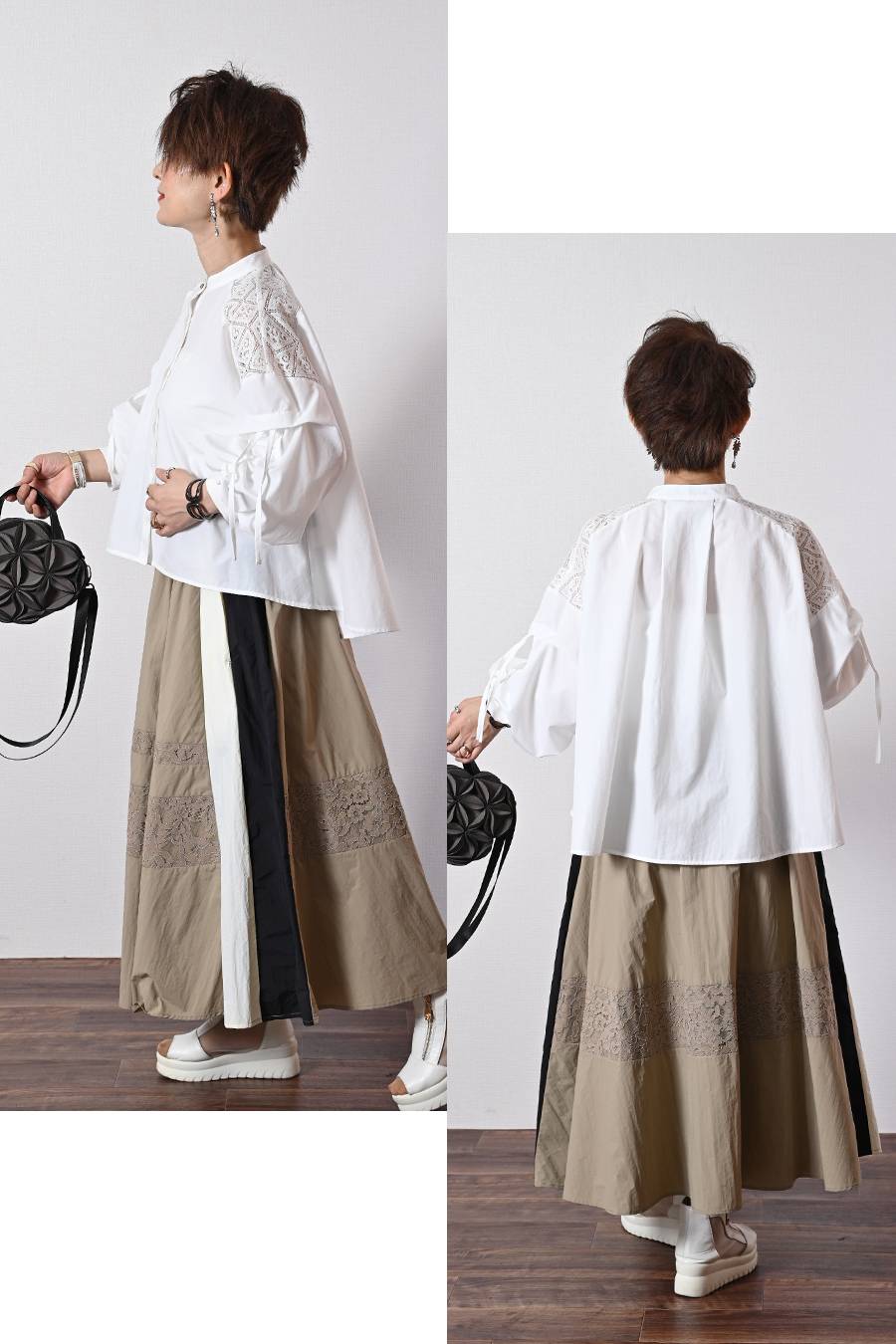 大人のビスチェ風レースブラウス+超軽量タフタ フレアスカート 2点セットコーデ