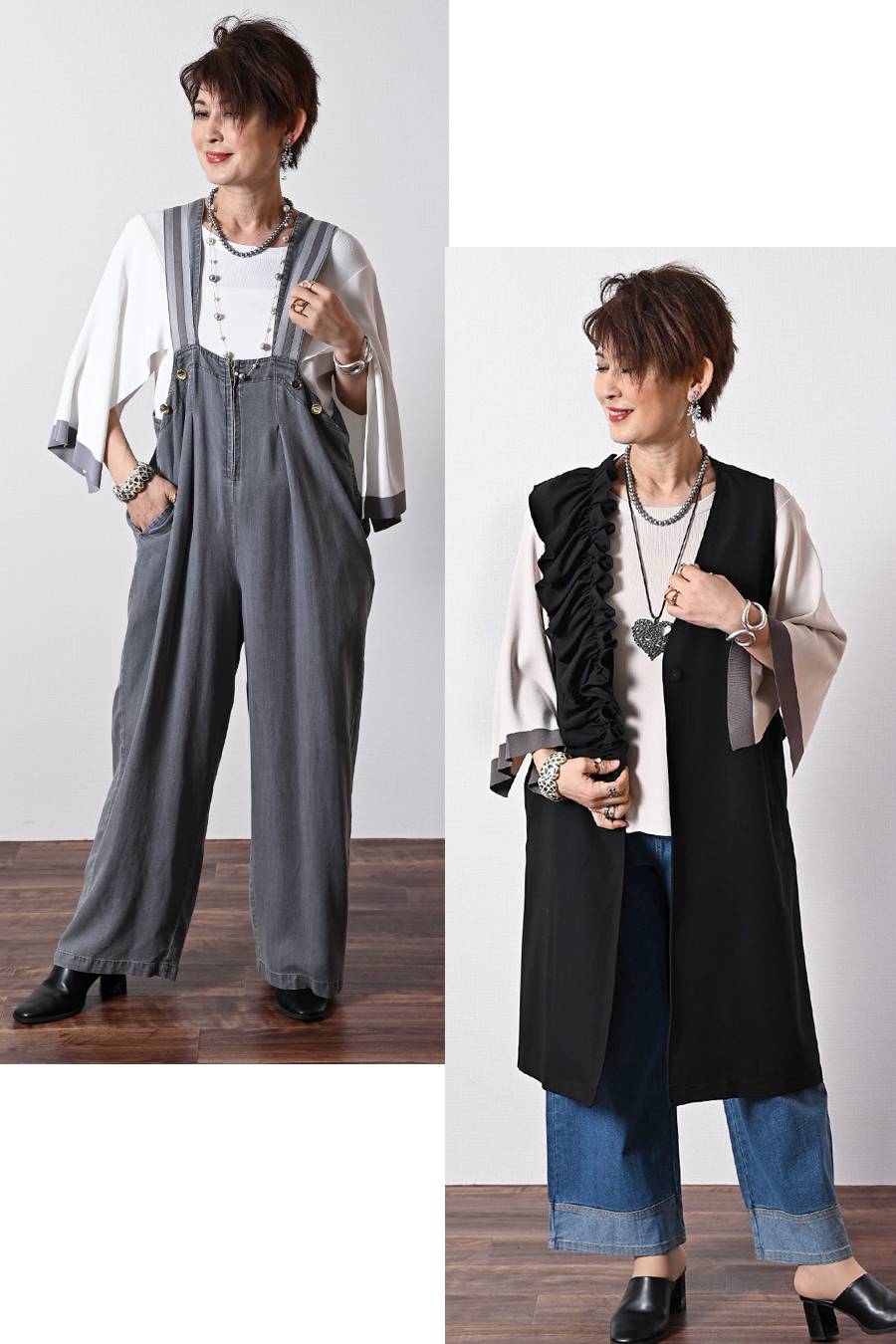 ボリュームスリーブブラウス+アシンメトリーラッフルフリルジレ2点セットコーデ
