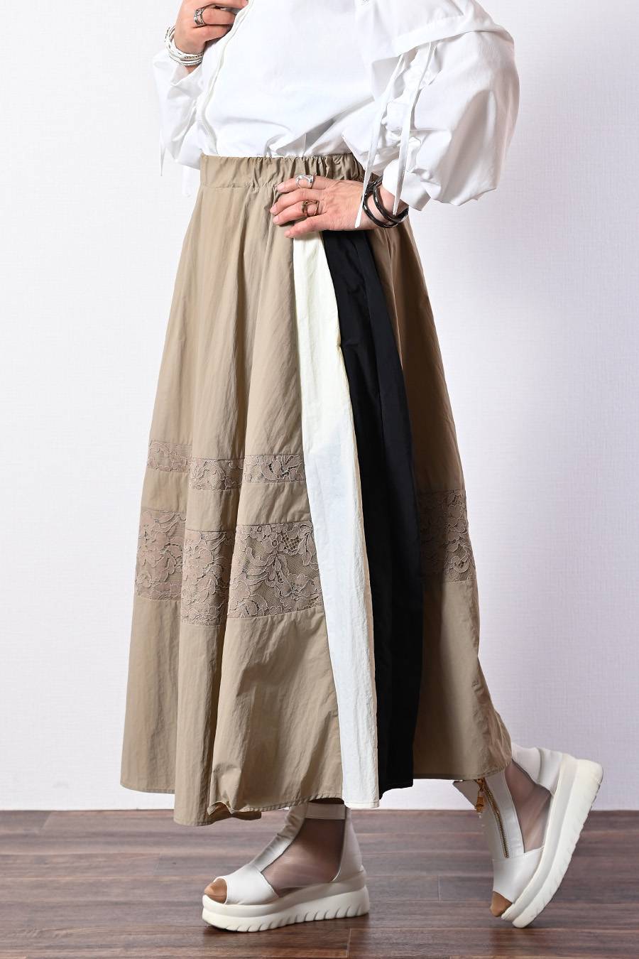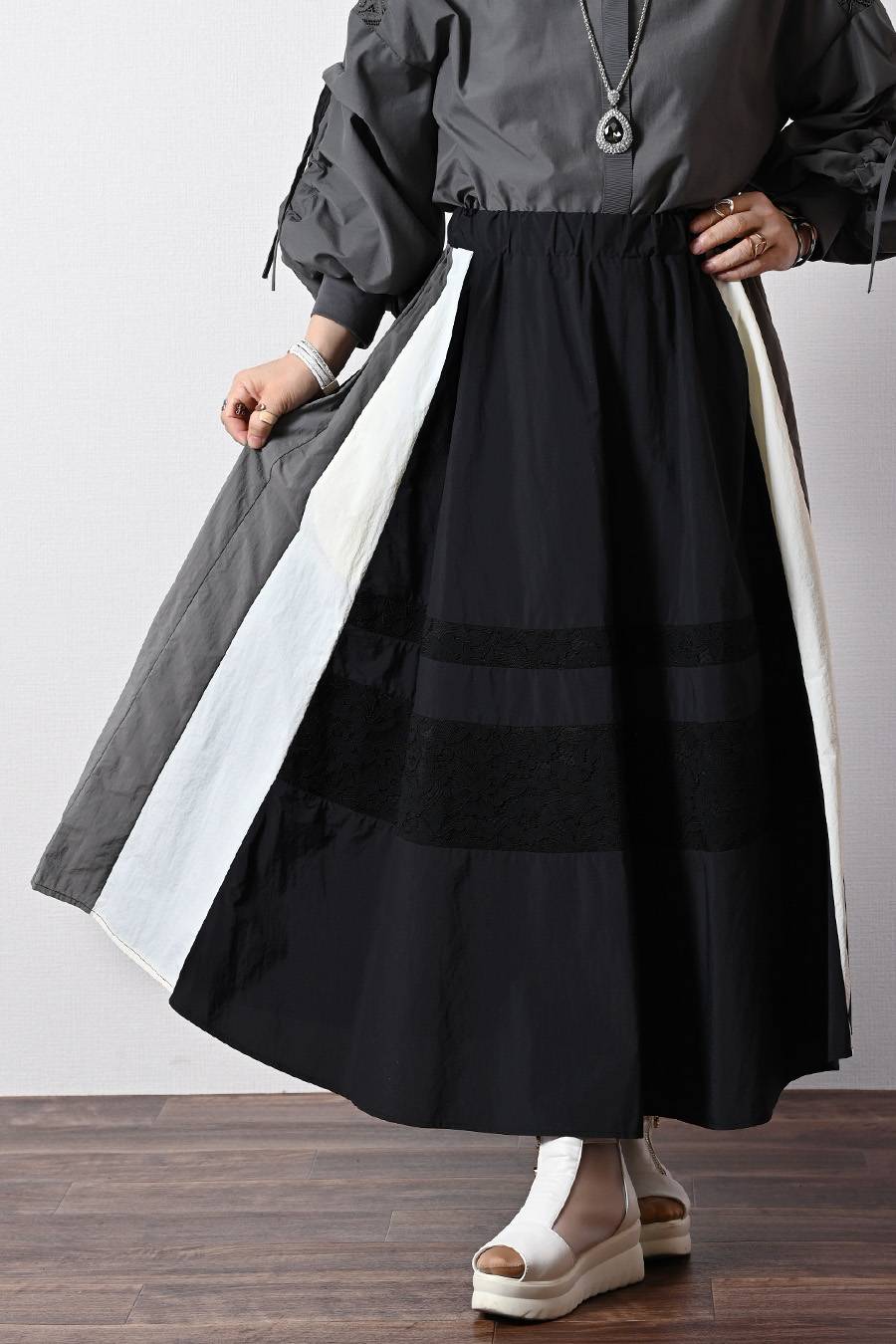 イレヘム配色ラインワイドプルオーバー+メッシュ切替フレアロングスカート2点セットコーデ