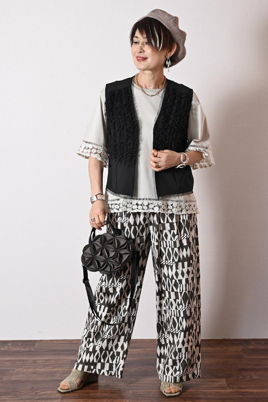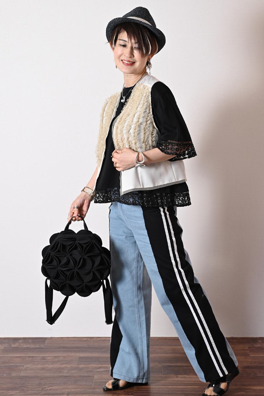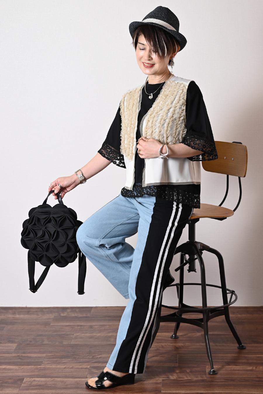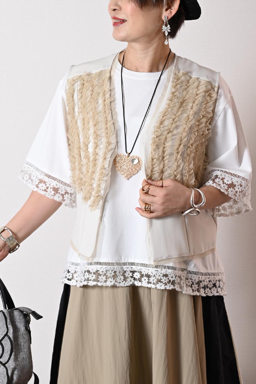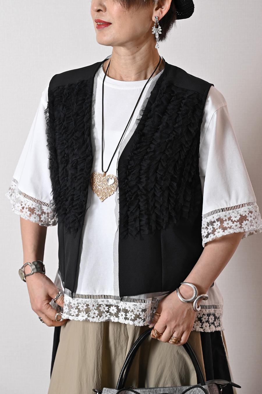 オーガンジーラメ糸刺繍トリミングカットソー+チュールフリル デザインベスト2点セットコーデ