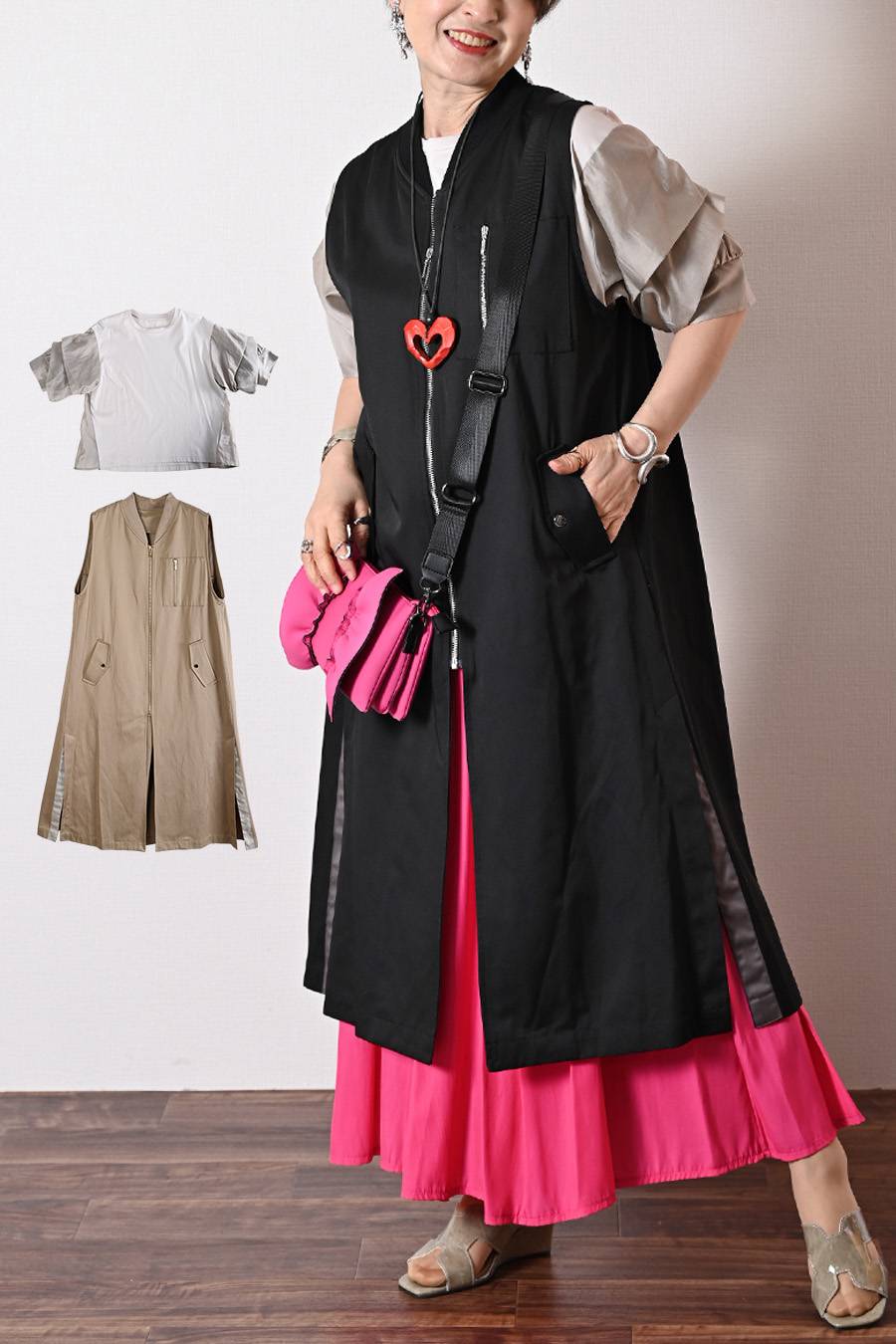 オーガンジーラメ糸刺繍トリミングカットソー+チュールフリル デザインベスト2点セットコーデ