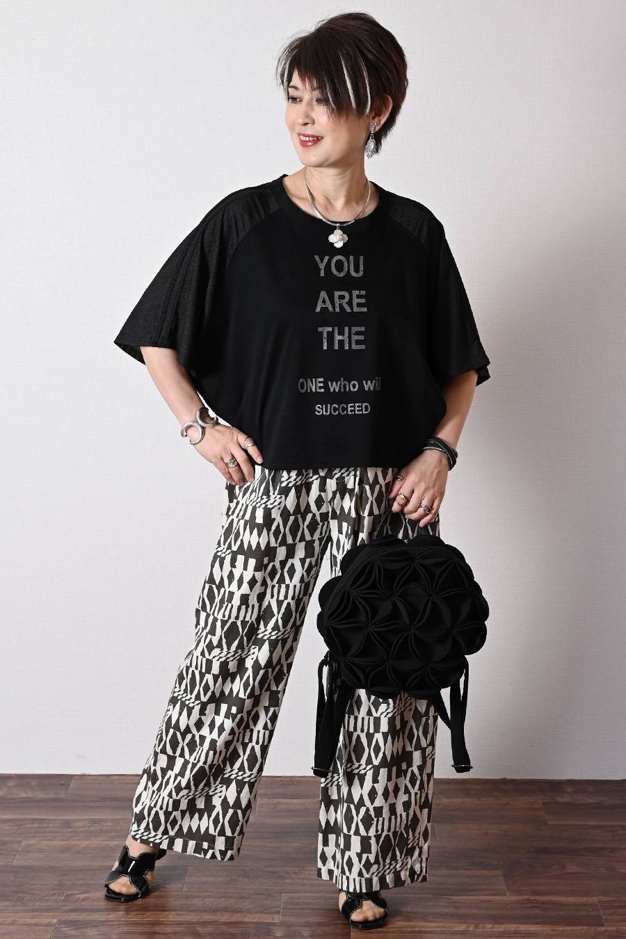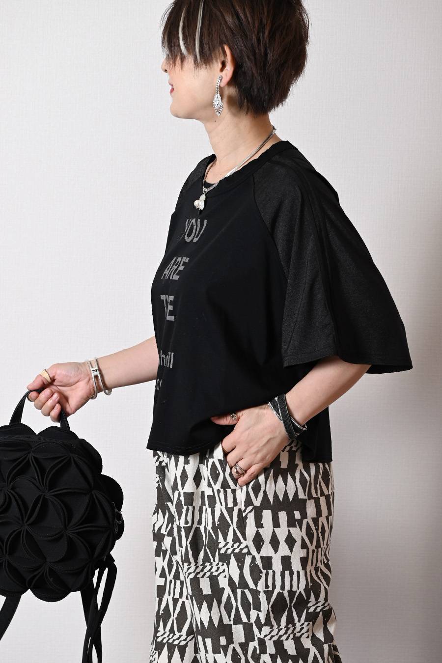 フロントに配したポジティブなメッセージプリントが目を引くドルマンスリーブプルオーバー。計算された異素材使いとシルエットが「上質な日常着」を演出します。