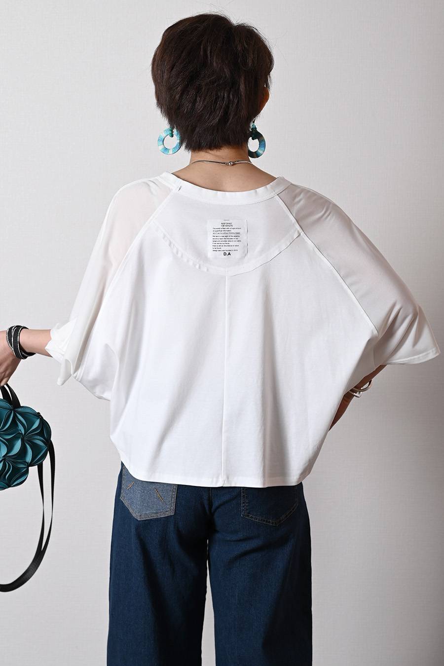 肩から袖にかけて繊細な冷涼感あるシアー素材で切り替え、ヘルシーな抜け感をプラス。肌馴染みの良いボディ生地とのコントラストが、都会的な印象を与え汗じみも目立ちづらいのが嬉しい。